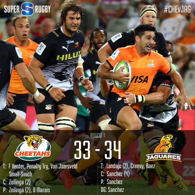Una primera mitad sin escrúpulos de un sorprendentemente y competitivo Cheetahs les ayudó a construir una enorme ventaja de 24-3, gracias a los problemas de disciplina que parecía haber apagado todas las aspiraciones de los Jaguares, antes de la primera la mitad. Martín Landajo y Nicolás Sánchez fueron expulsados en los primeros quince minutos de partido, pero la franquicia Argentina respondió bien, y con la reaparicion de los armadores logro en parejar el marcador al llegar a la mitad del segundo tiempo